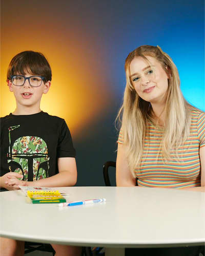 Create a balloon-themed birthday card for a friend alongside Almog as he and Hayley talk about friendship, their favorite colors, and plans for Almog's next birthday party.