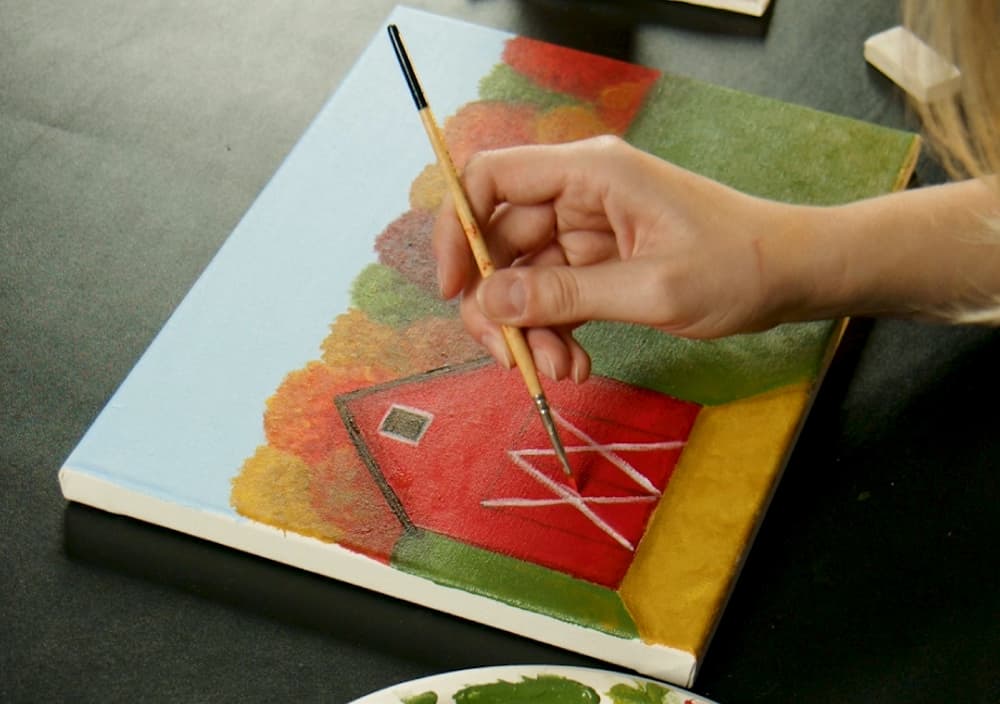 Create a simple, rustic acrylic landscape painting of a red barn over a background of colorful...