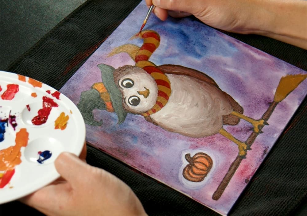 Paint an adorably expressive owl in a scarf taking flight on a witch’s broom with artist Matt...